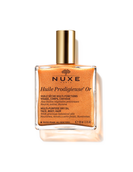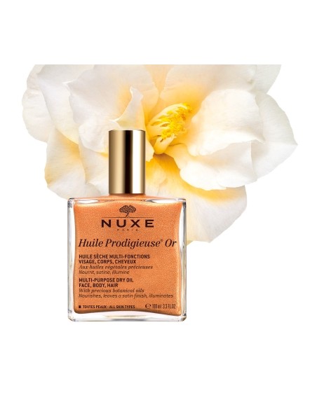 La versión brillante del Huile Prodigieuse®, nutre, suaviza e ilumina la piel y el cabello, gracias a sus finos nácares de origen mineral. La textura del aceite seco es única y su fragancia, envolvente.