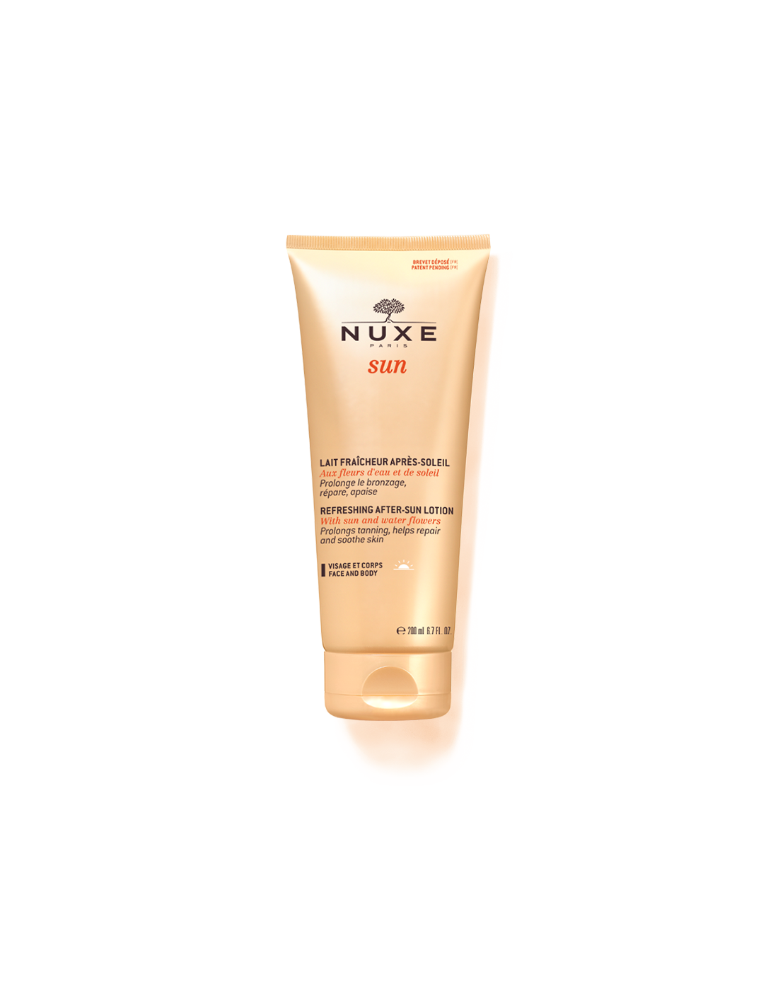 Aplique generosamente y de manera uniforma la Leche Facial y Corporal Refrescante para Después del Sol NUXE Sun tras la exposición solar y al regresar de las vacaciones.