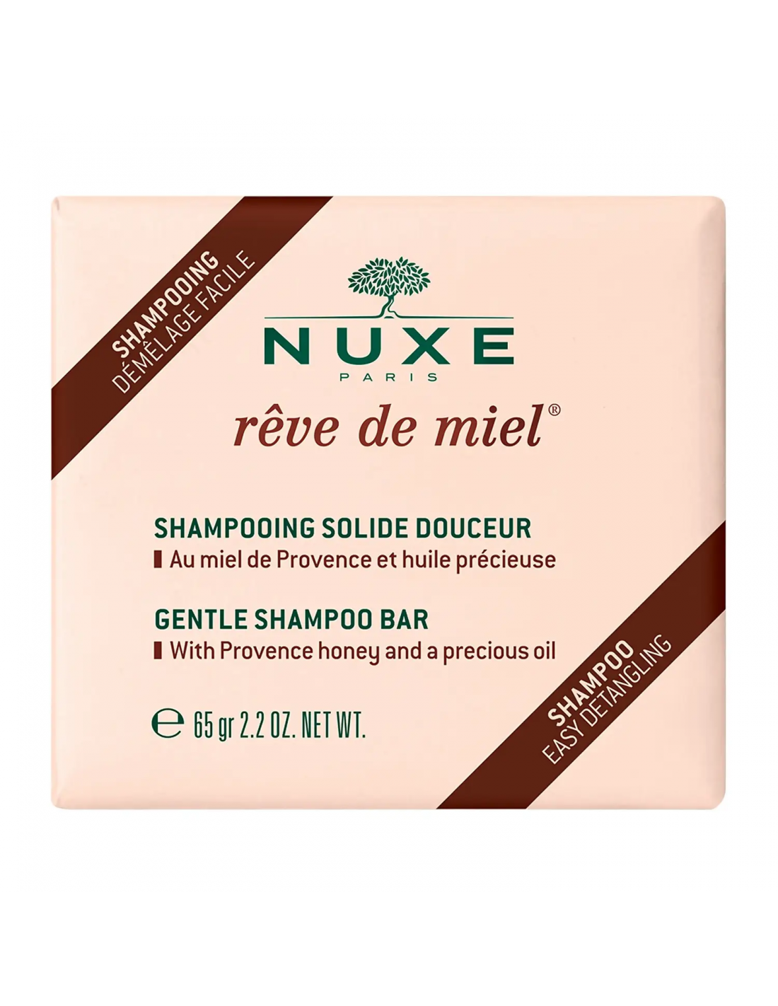 Descubra todo el confort de Rêve de Miel en un champú sólido que envuelve el cabello con suavidad gracias a la Miel de Provenza y al Aceite precioso de Camelina bio.