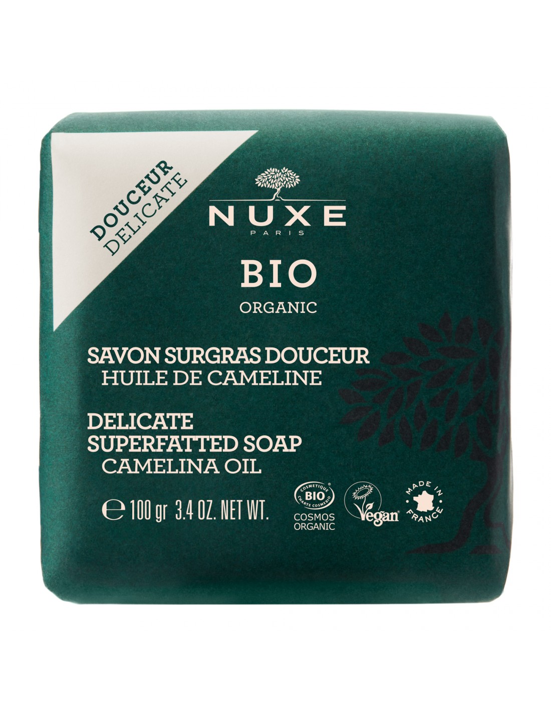 Este jabón dermatológico bio limpia eficazmente rostro y cuerpo respetando todos los tipos de piel gracias a su textura de tratamiento cremosa enriquecida con Aceite de Camelina Bio.