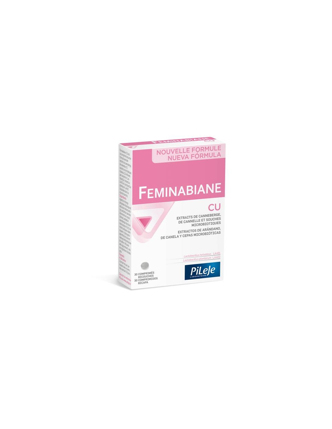 Feminabiane CU es un comprimido bicapa formulado con extractos de arándano, de canela y 2 cepas microbióticas dosificadas a 2.500 millones por comprimido: L. helveticus LA401 y L. plantarum LA402 (ubicadas en la capa blanca).