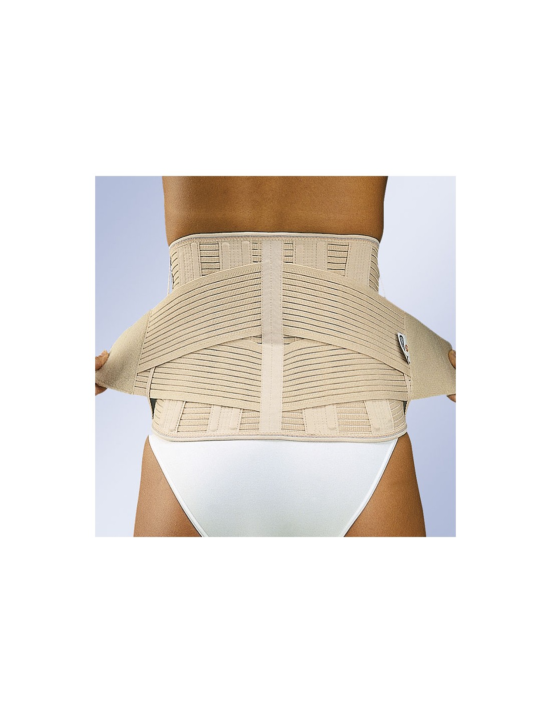 Tejido multibanda transpirable, 8 ballenas de acero posteriores maleables, cierre anterior de velcro. Con refuerzos elásticos para aumentar la compresión antero posterior.
