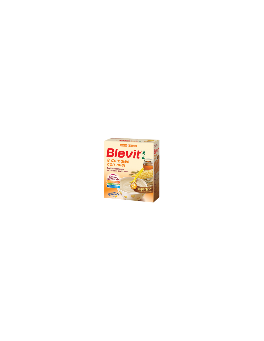Blevit plus Superfibra 8 Cereales con miel aporta un Efecto Superfibra, por su contenido en cereales integrales (fibra insoluble) e inulina y FOS (fibra soluble), que combinados ayudan a regular el tránsito intestinal. Blevit plus Superfibra 8 Cereales con miel se prepara de forma instantánea, proporcionando una papilla de textura suave, homogénea y de agradable sabor.