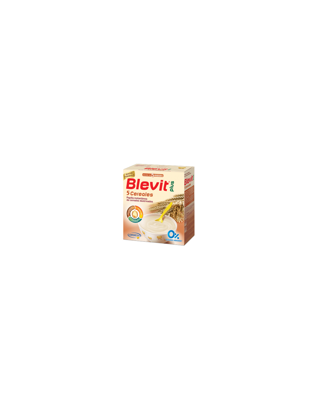 Blevit plus 5 Cereales es una papilla de cereales elaborada a partir de trigo, centeno, avena, cebada y arroz, que incorpora cereales integrales en su composición y no contiene azúcares añadidos.