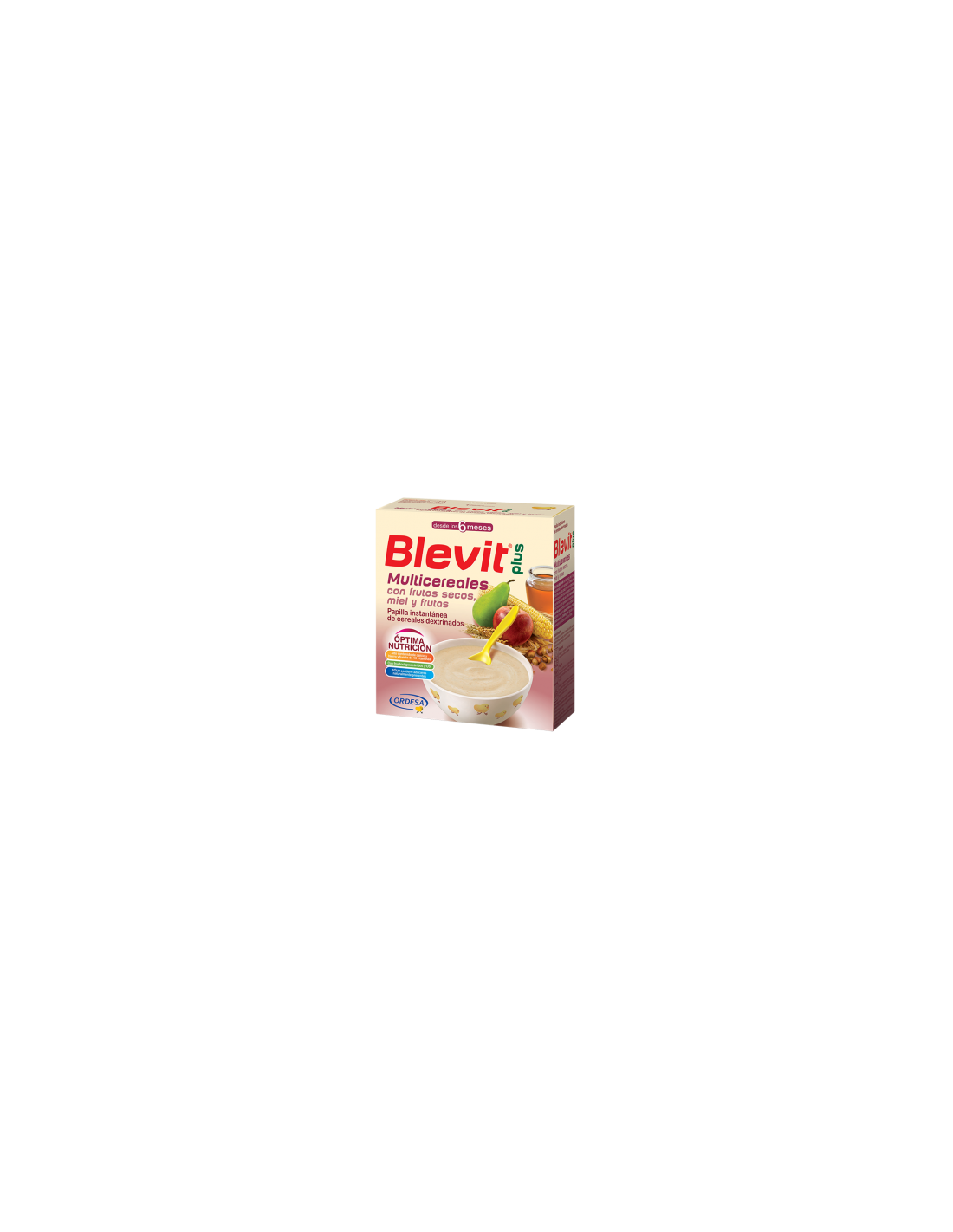 Blevit plus Multicereales con frutos secos, miel y frutas está elaborada a base de una mezcla equilibrada de 7 cereales, miel, frutas (manzanas, peras y pasas) y frutos secos (almendras y avellanas) que le aportan un alto valor energético y nutricional, y que hacen que sea la papilla más completa, la superpapilla.