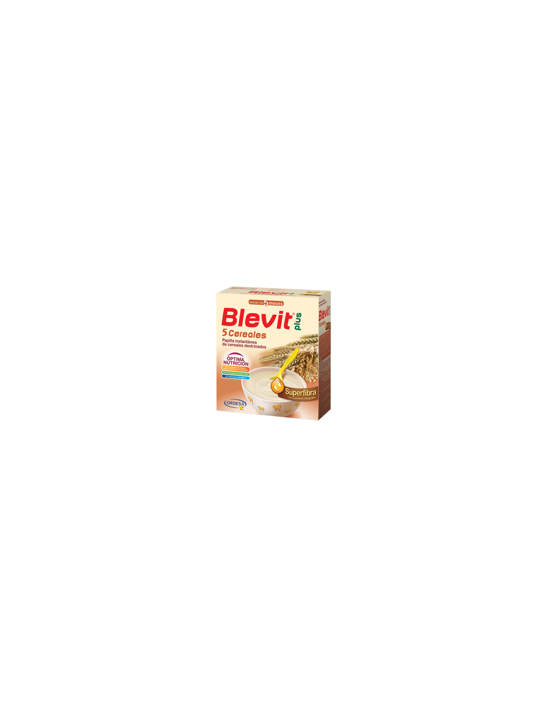 Blevit plus Superfibra 5 Cereales aporta un Efecto Superfibra, por su contenido en cereales integrales (fibra insoluble) e inulina y FOS (fibra soluble), que combinados ayudan a regular el tránsito intestinal. Blevit plus Superfibra 5 Cereales se prepara de forma instantánea, proporcionando una papilla de textura suave, homogénea y de agradable sabor.