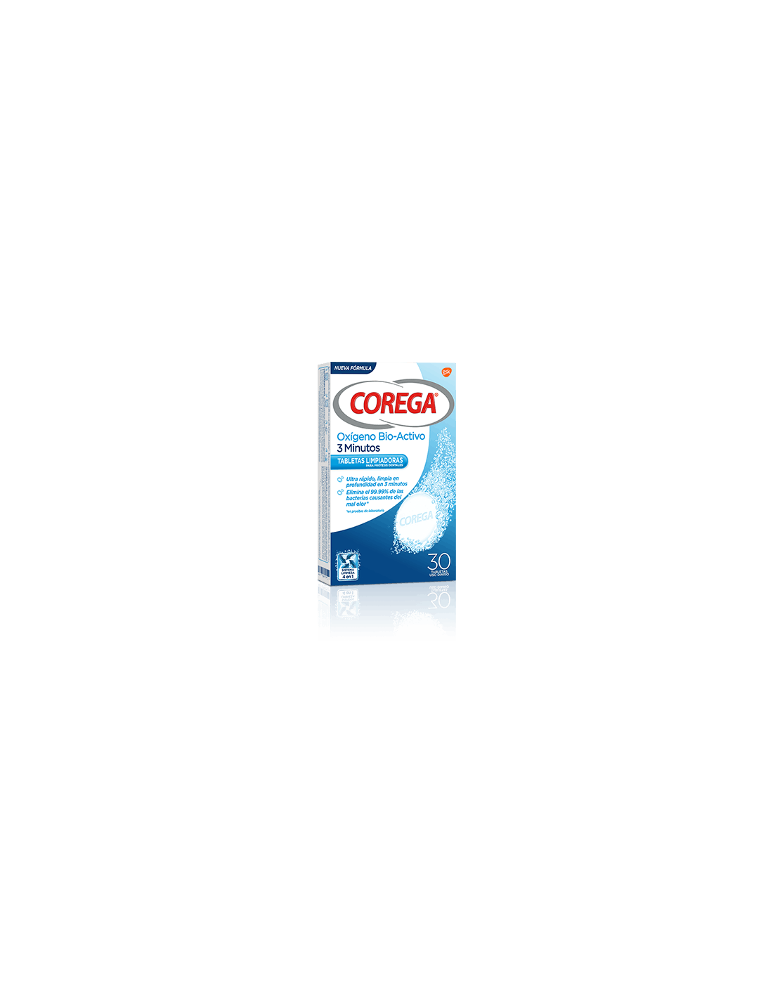 Las tabletas COREGA Oxígeno Bio-Activo 3 Minutos eliminan el 99.9% de las bacterias causantes del mal olor, y cuando se usan según las instrucciones ayudan a eliminar las manchas persistentes dejando su prótesis dental más limpia y fresca.