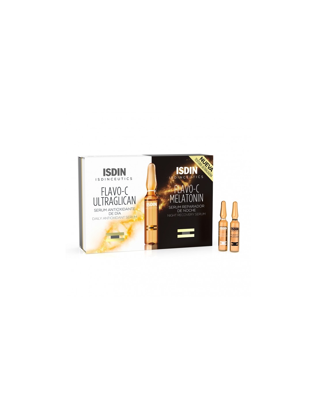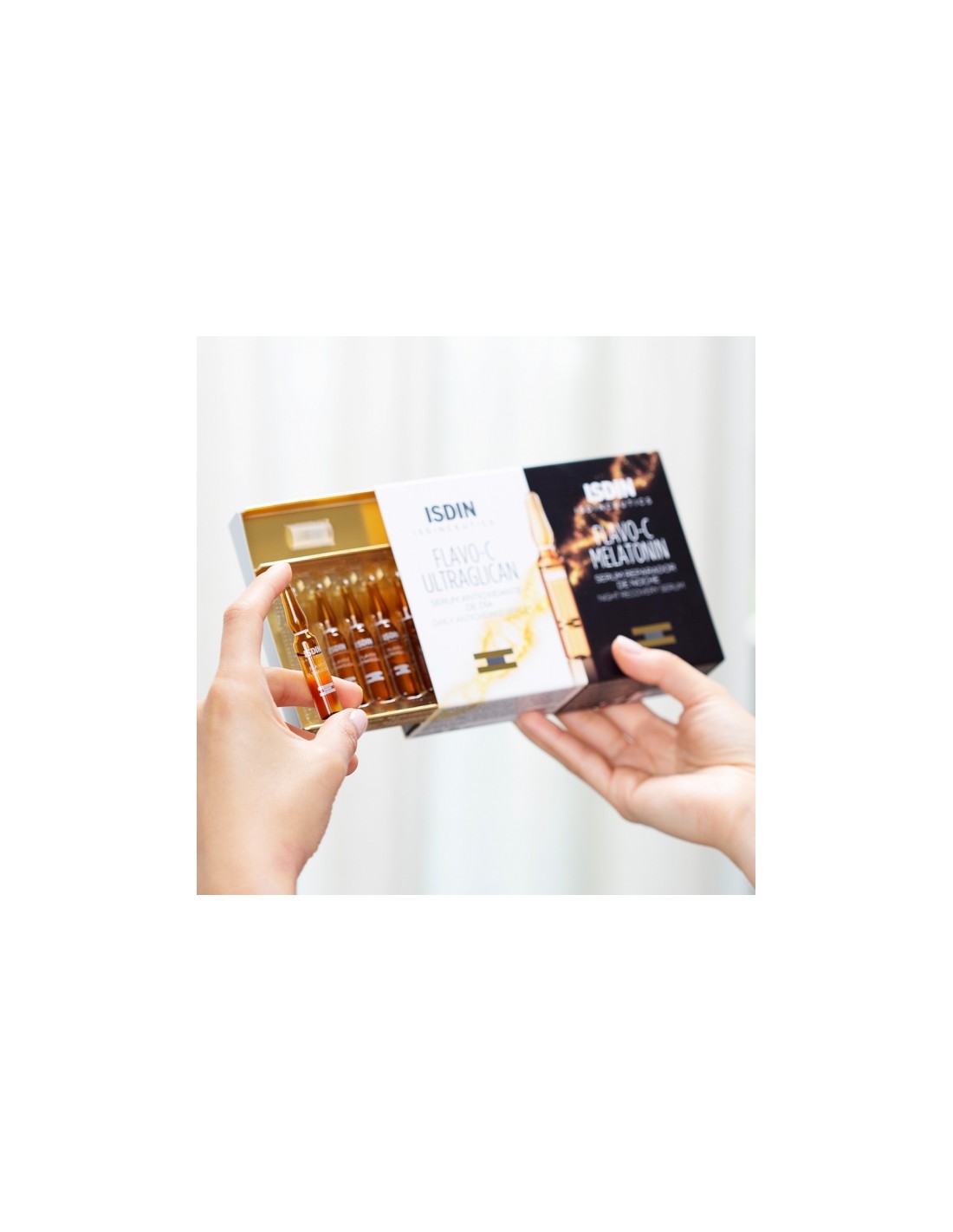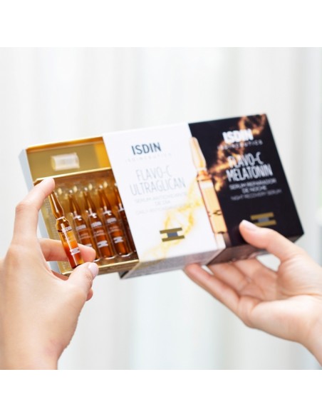 Con Isdinceutics Flavo-C Ultraglican tu piel estará protegida durante el día y gracias a Flavo-C Melatonin podrá recuperarse y repararse durante la noche.