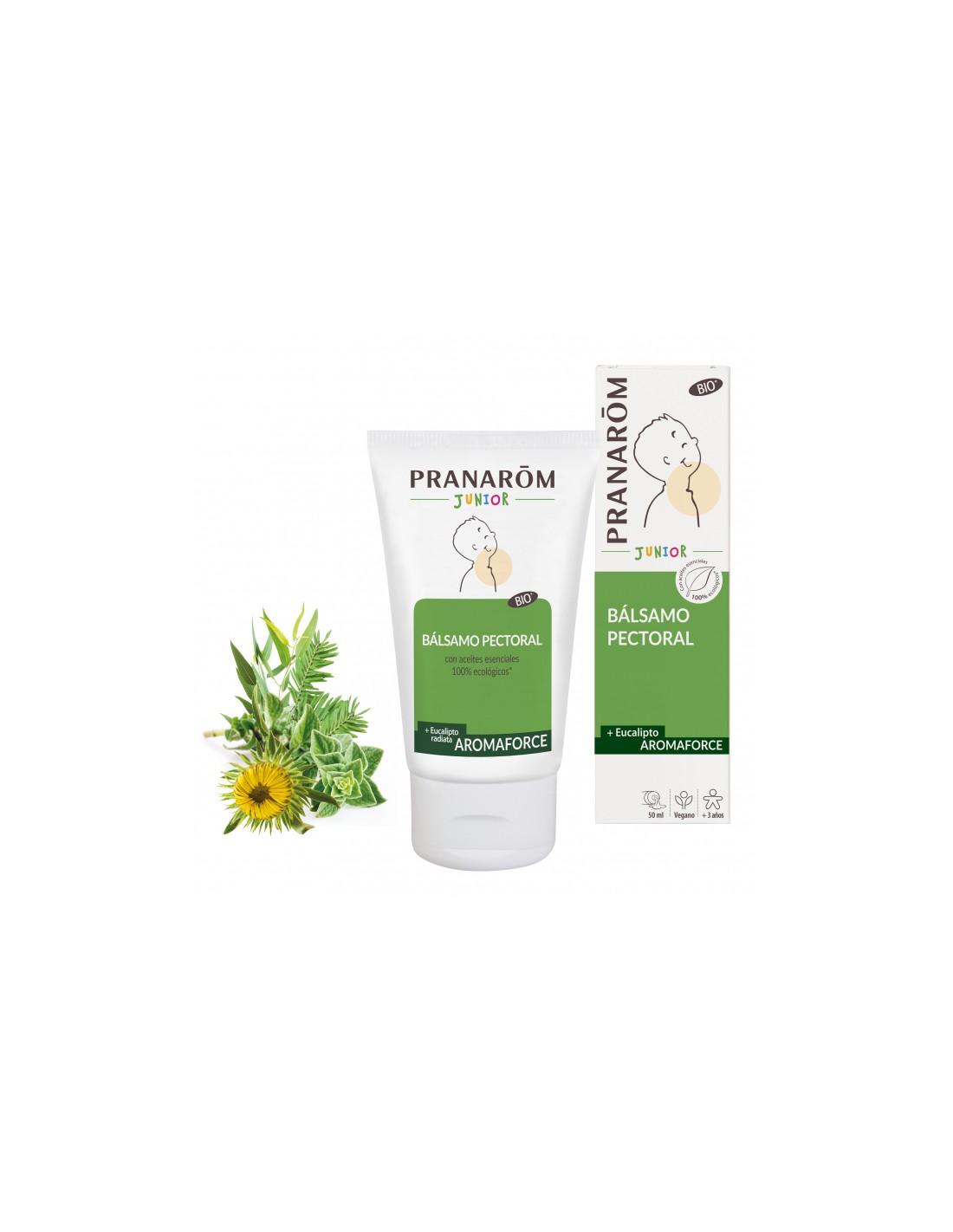 El Bálsamo pectoral Aromaforce Junior contiene aceites esenciales 100% ecológicos de eucalipto radiata, mejorana, tomillo quimiotipo tuyanol, ravintsara, menta de campo, abeto balsámico y olivardilla, con un olor refrescante y purificante.