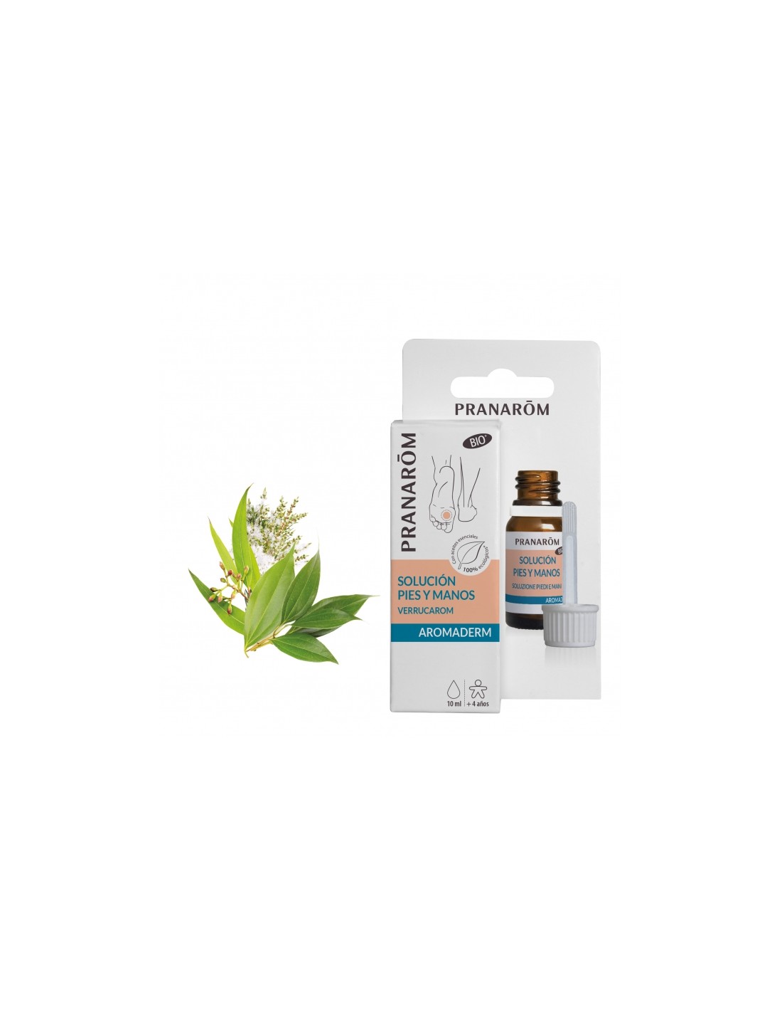 AROMADERM Verrucarom solución Pies y manos BIO permite actuar con precisión en la zona gracias a los aceites esenciales de canela de China, verbena exótica, árbol del té, niaulí y eucalipto mentolado, y al aceite vegetal de ricino. La piel se sanea, se regenera de forma natural y recupera un aspecto saludable.