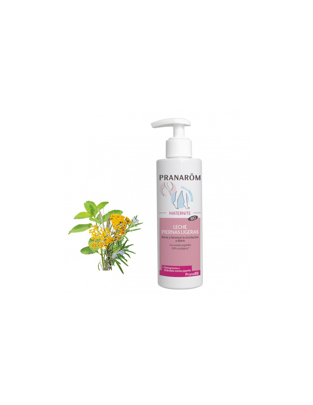 La Leche Piernas Ligeras PRANABB MATERNITÉ alivia la sensación de piernas pesadas y cansadas desde los primeros meses del embarazo, gracias a una sinergia de aceites esenciales de romero quimiotipo cineol, siempreviva amarilla y cade, conocidos por su efecto tonificante circulatorio.
